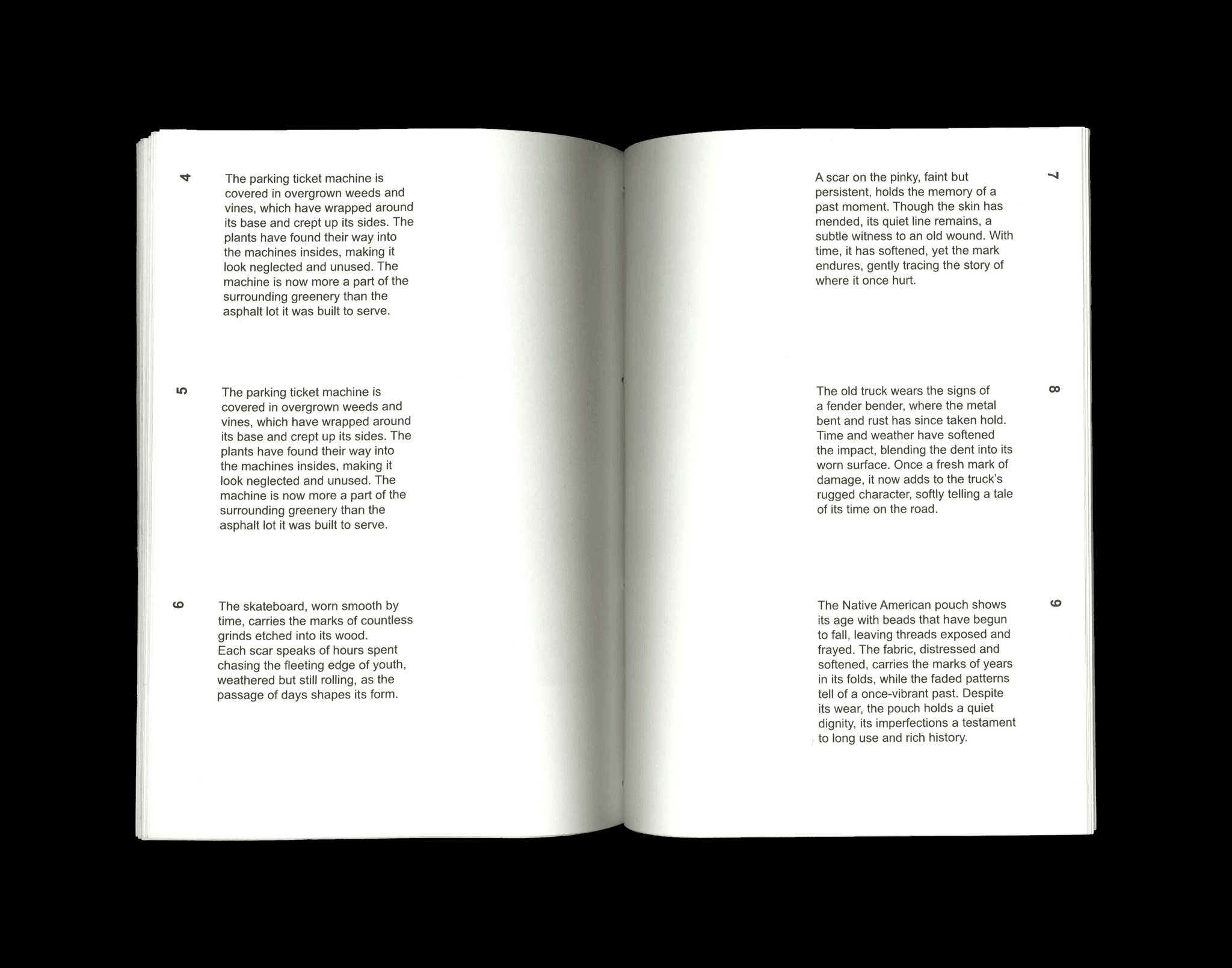 Cracked & Faded is a photo archive book exploring the beauty of objects worn down over time. Through original photographs, the project highlights scratches, fading, and imperfections as visual records of use and history. An index in the back pairs each image with a short poem or excerpt that reflects on the story behind the object.