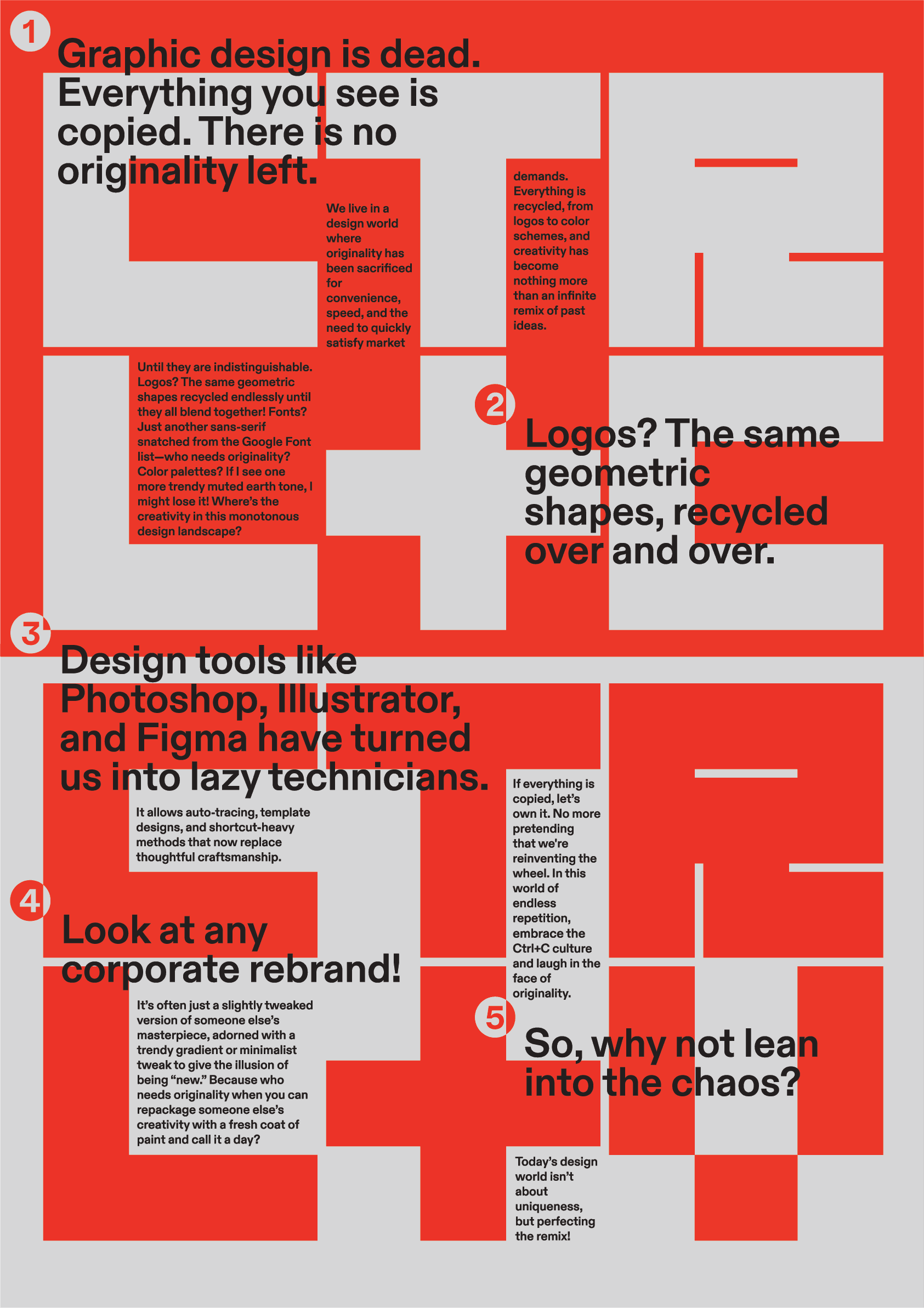 Ctrl+C Ctrl+V is a design manifesto that critiques the illusion of originality in modern graphic design. Using bold typography and a structured layout, the piece explores how repeated trends, recycled forms, and common design tools have shaped a culture of remixing rather than inventing.