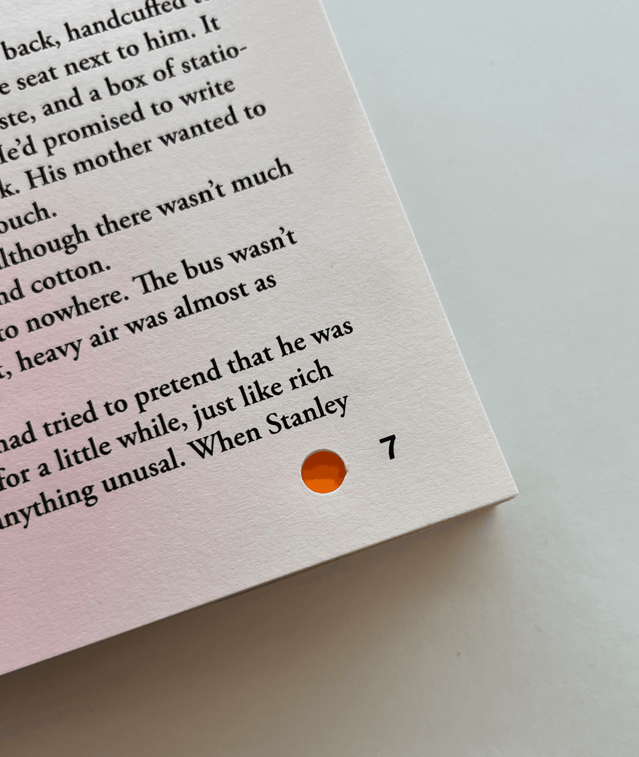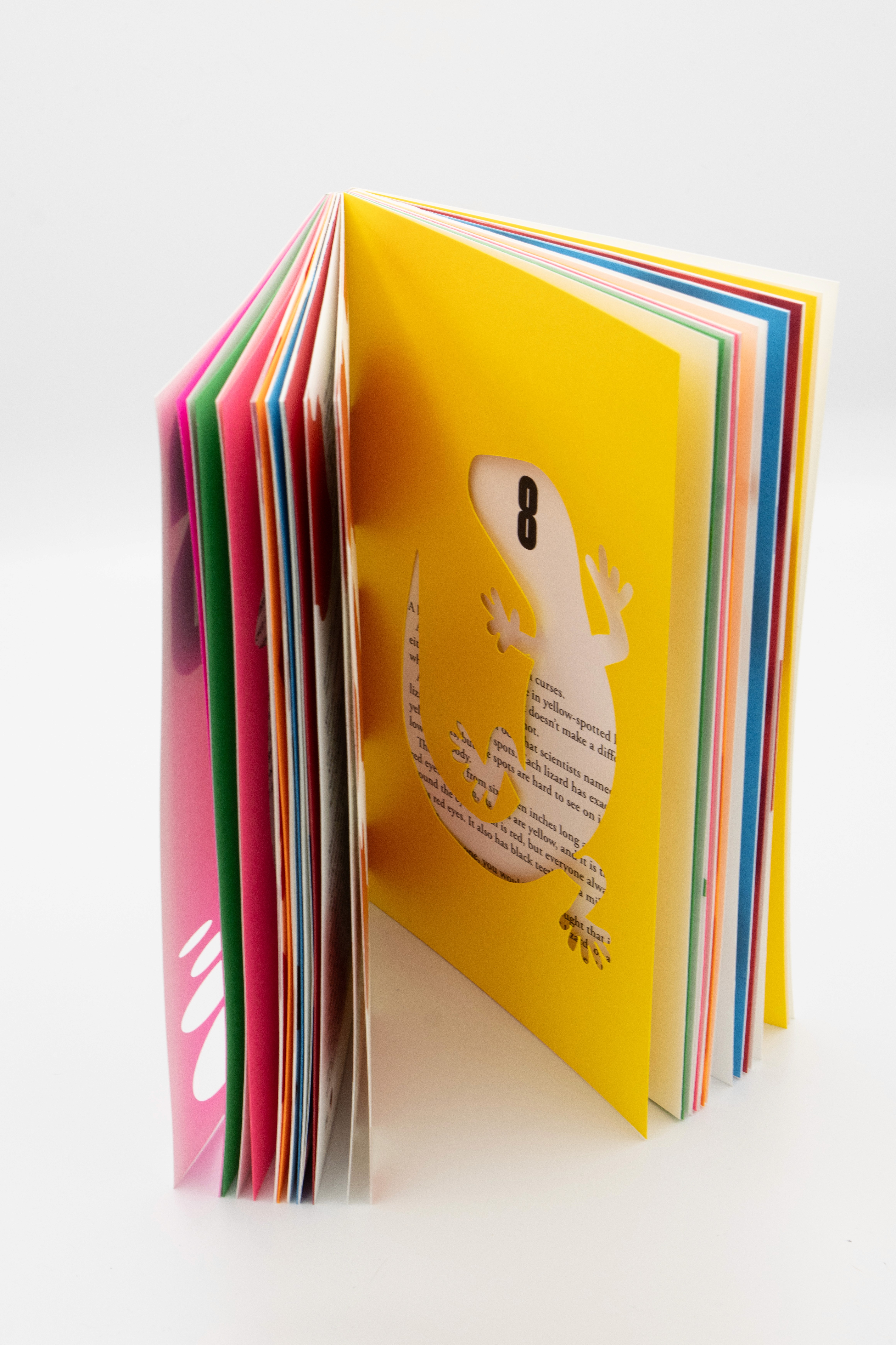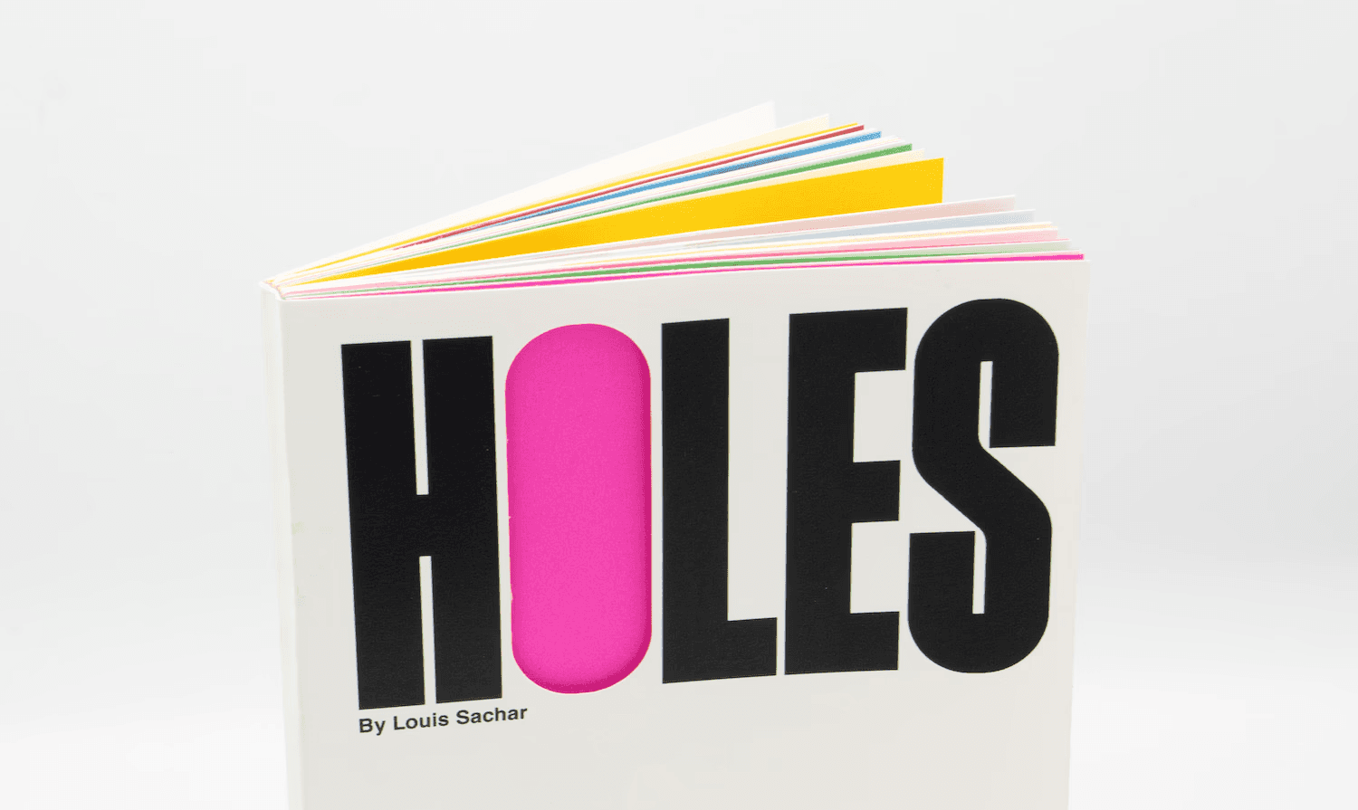 This project is a redesign of Holes by Louis Sachar that uses hole-punched shapes throughout the book. Each chapter features a cut-out based on an important object from the story, allowing the color of the next chapter to peek through. Brightly colored paper adds contrast and turns the holes into a visual storytelling element.